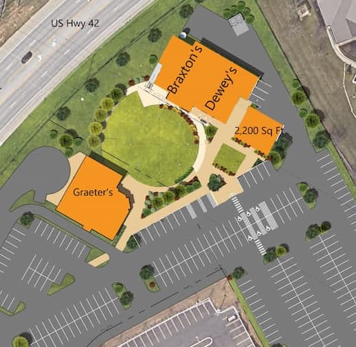 Located in the heart of Union, Kentucky, Union Commons offers a unique leasing opportunity for businesses seeking visibility and traffic. Positioned next to Union Marketplace, a regional shopping center, Union Commons benefits from an established, thriving retail environment that includes tenants such as Kroger, Wings and Rings, Graeter’s, Braxton Brewery, Dewey’s Pizza, and more. The location features distinctive architecture and green spaces that enhance its appeal.